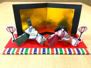 「雛飾り」はケアマネが担当させて頂いている利用者様の作品で、材料集めや簡単な折り方などアドバイスも頂きました。 ふっくらとした曲がり,襟元の閉まり具合,髪の毛の束感 など些細なところに皆さんの個性が光ります!